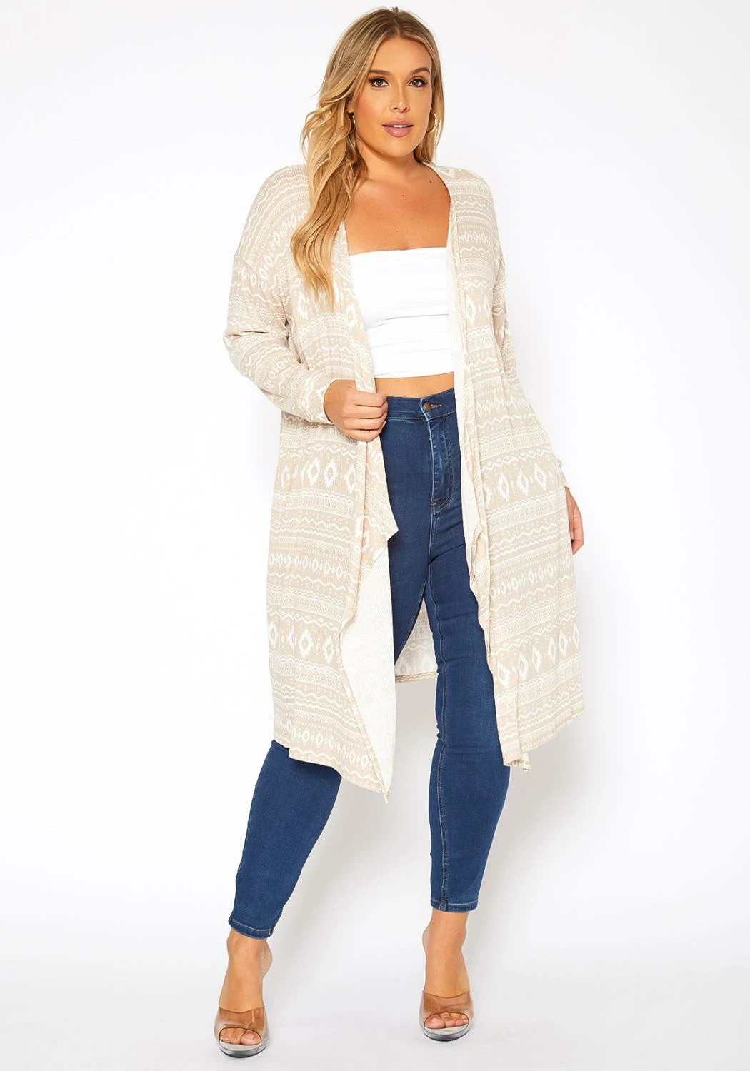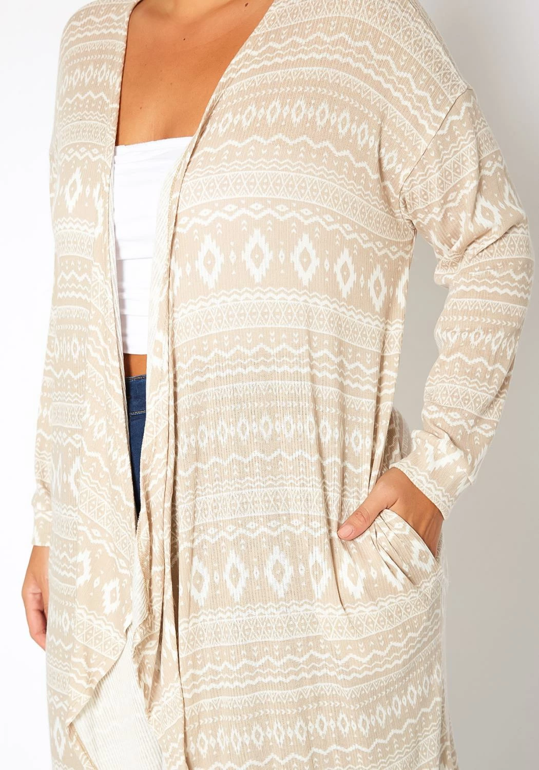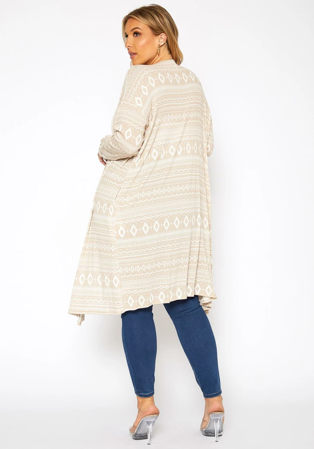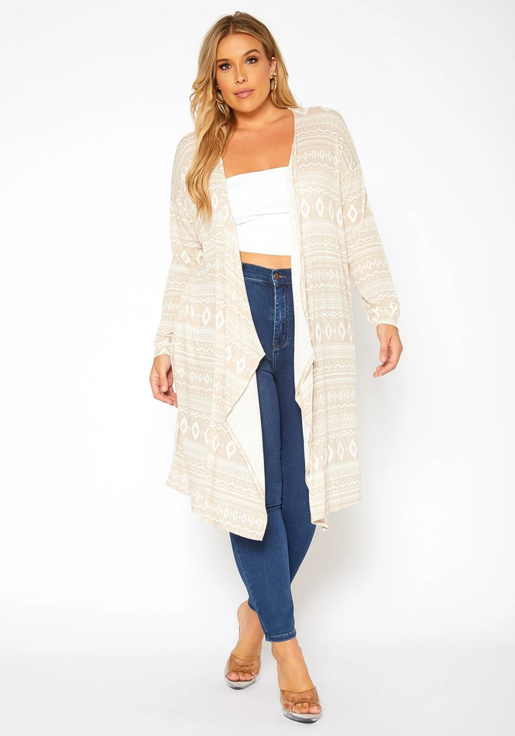 Casual cardigan for plus size women in boho print, open front style, waterfall drape-front hem, fitted long sleeves and knee length.