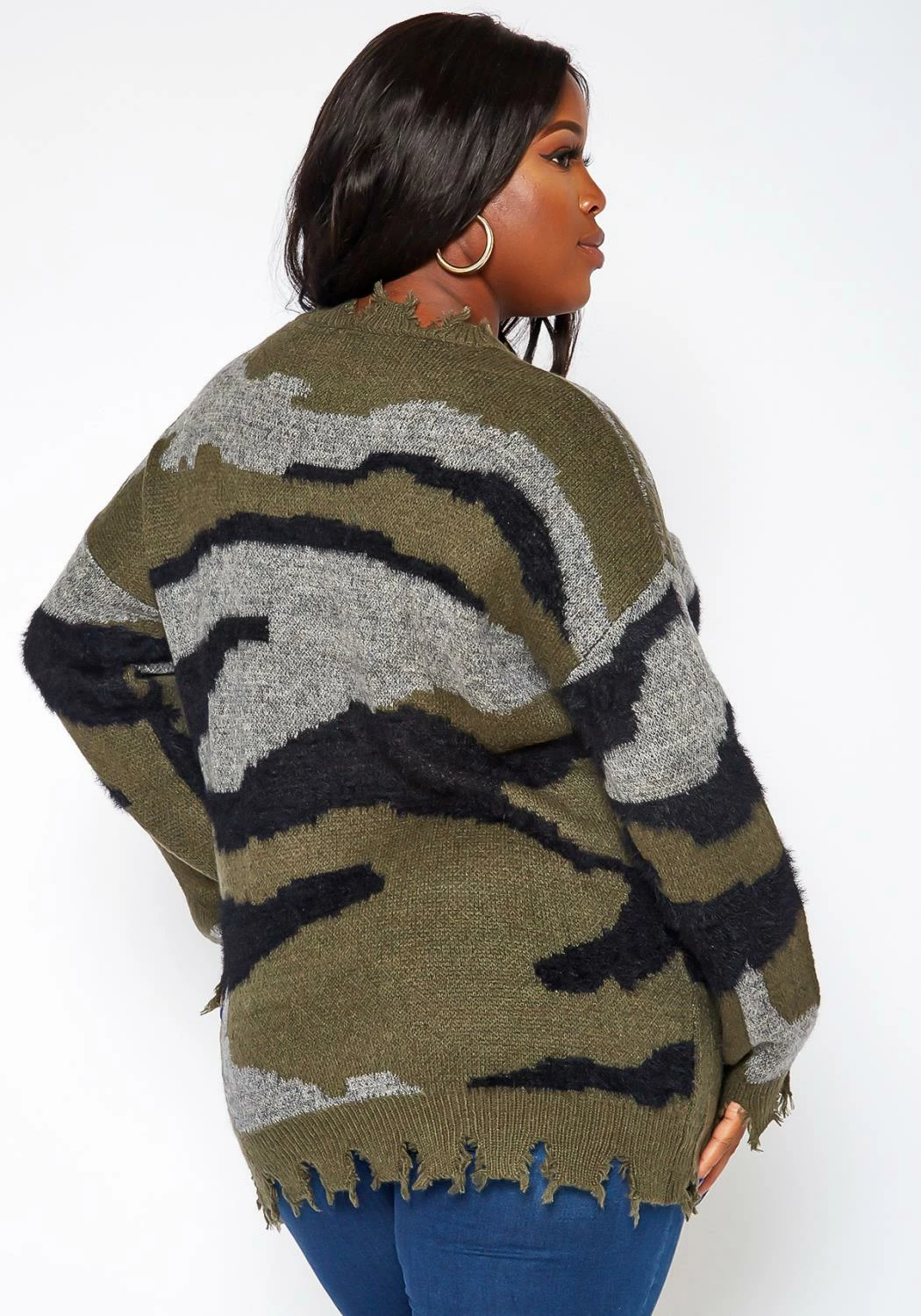 Trendy knit sweater in camo print, v-neck style, drop shoulder long sleeves and distress details.
