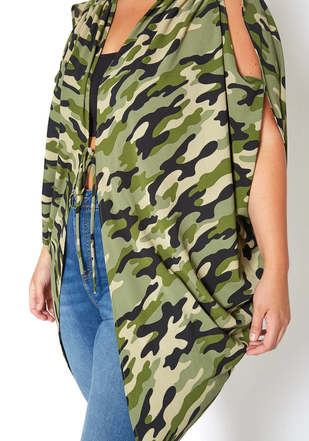 Plus size womens perfect throw on layer in fresh olive camo print design, tie front closure and angel sleeves with double cut-out ascent.