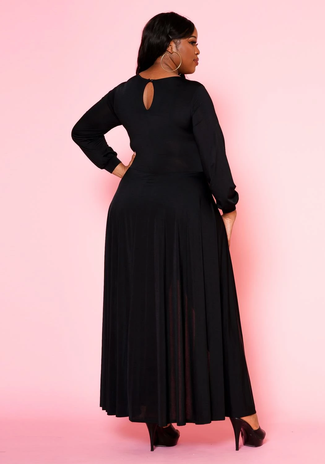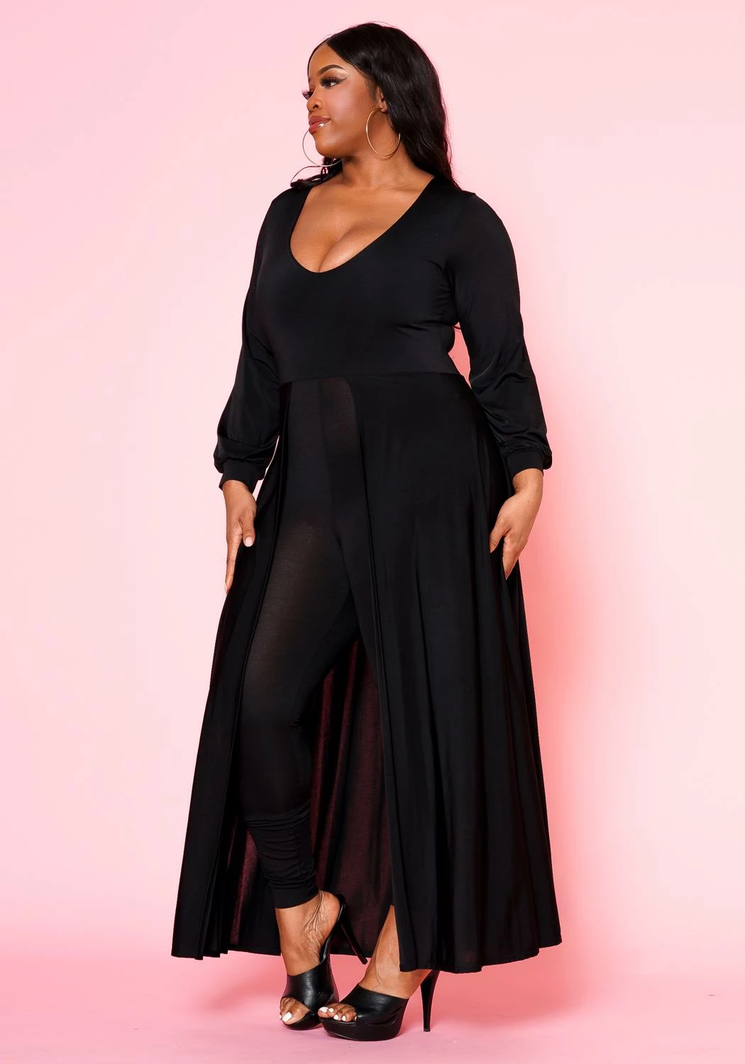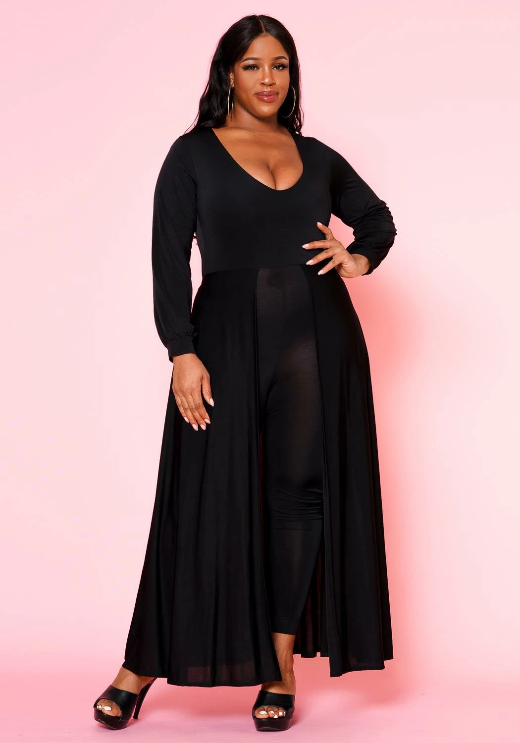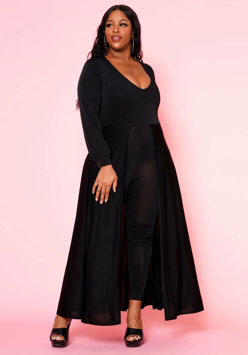 Plus size women’s scoop neck long sleeve jumpsuit with long caped skirt.