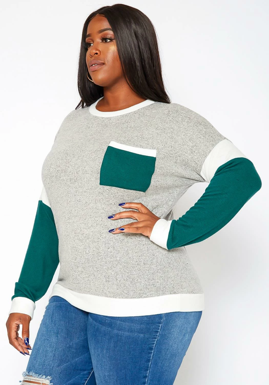 Casual plus size women’s knit sweater in crew neck style, color block design and pocket hem.