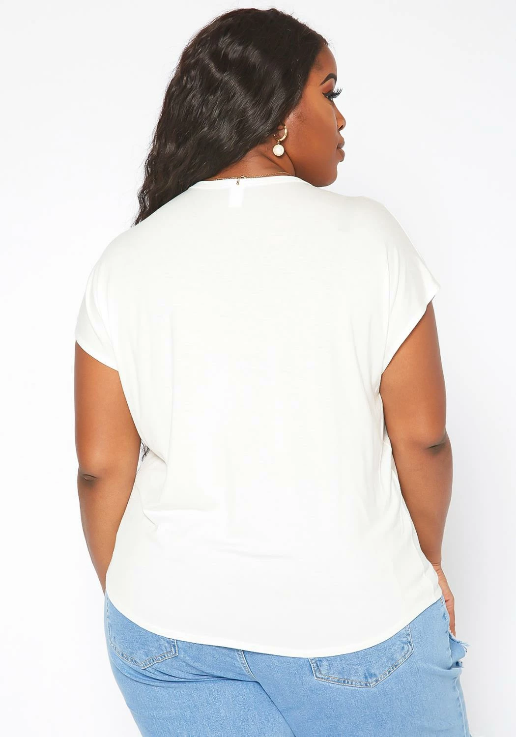 Plus size women’s basic t-shirt in v-neck front, short sleeves, crochet hem and relaxed fit.