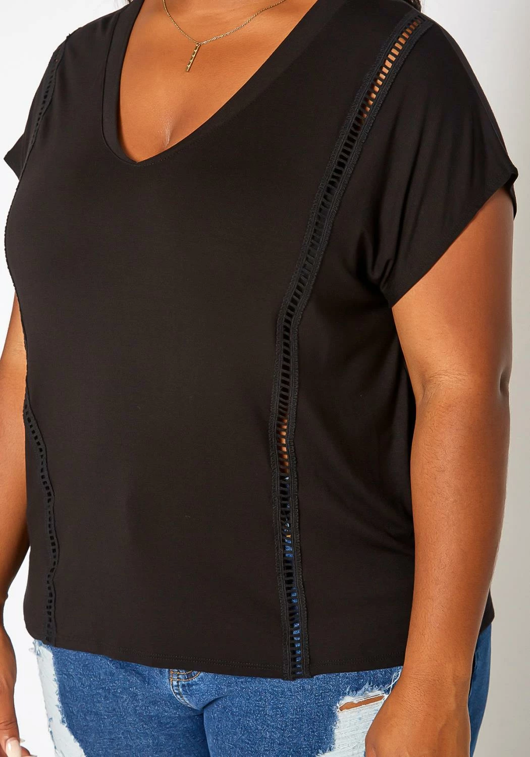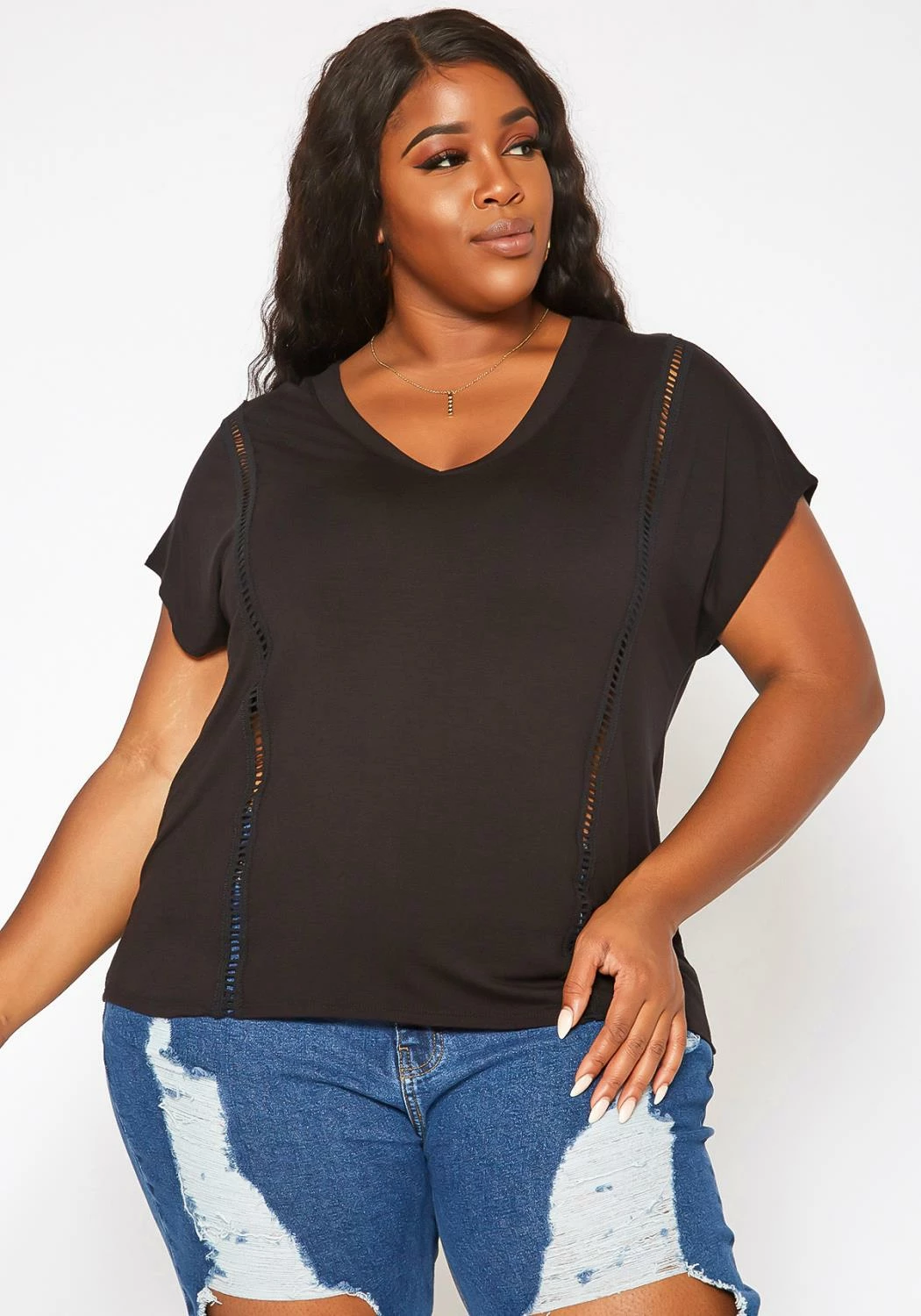 Plus size women’s basic t-shirt in v-neck front, short sleeves, crochet hem and relaxed fit.