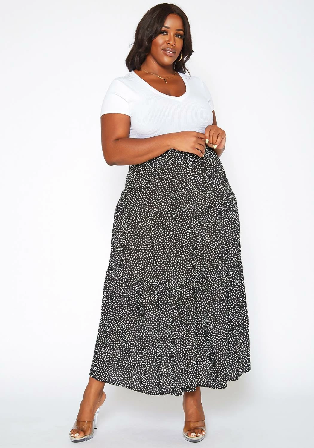 Lovely maxi skirt for plus size women in dainty floral print, high waist style, tiered design and wide flare.