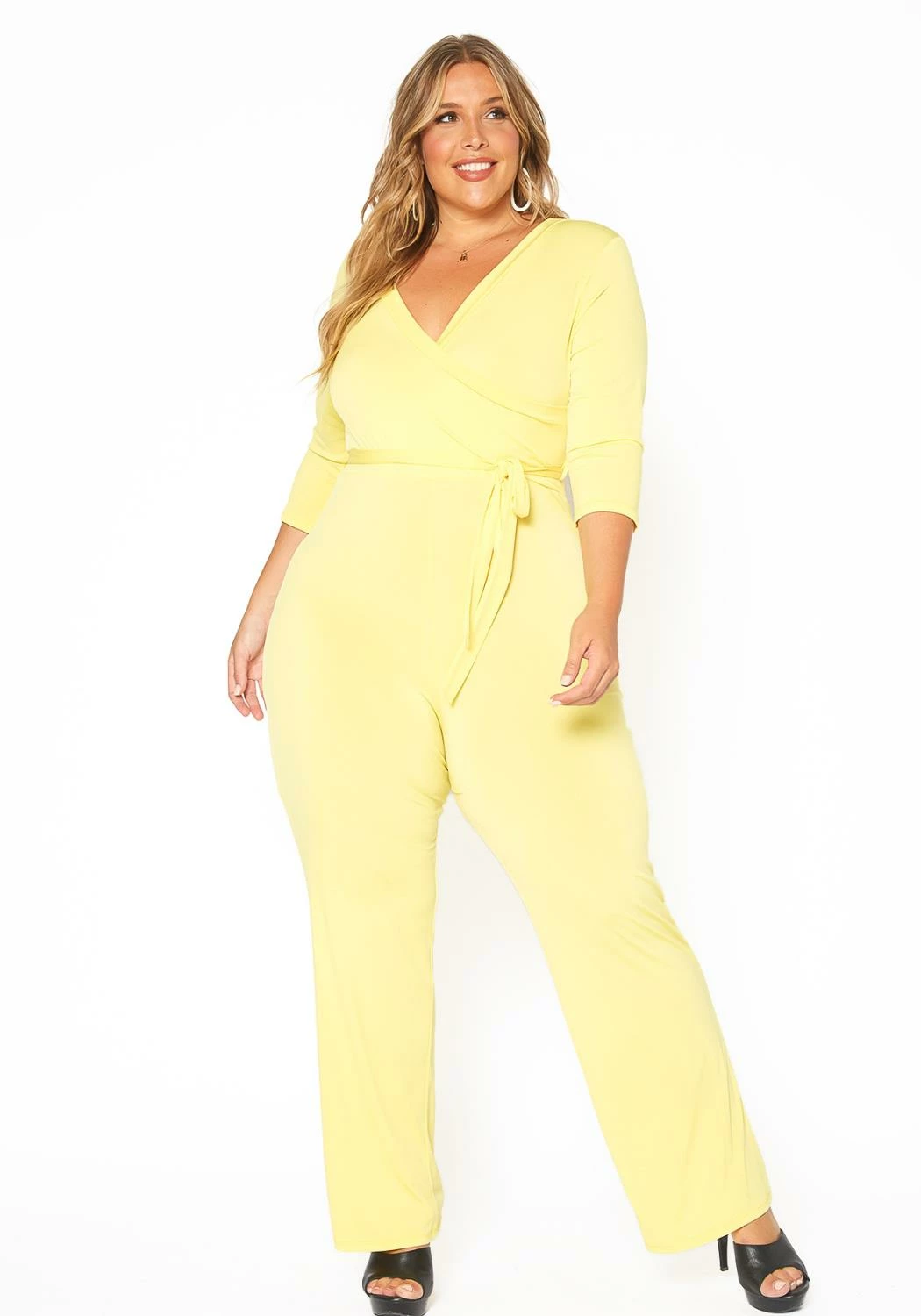 Keep it elegant in our sincere plus size women’s jumpsuit. Features an overlay surplice, 3/4 long sleeves, flare leg style and includes a matching waist tie.