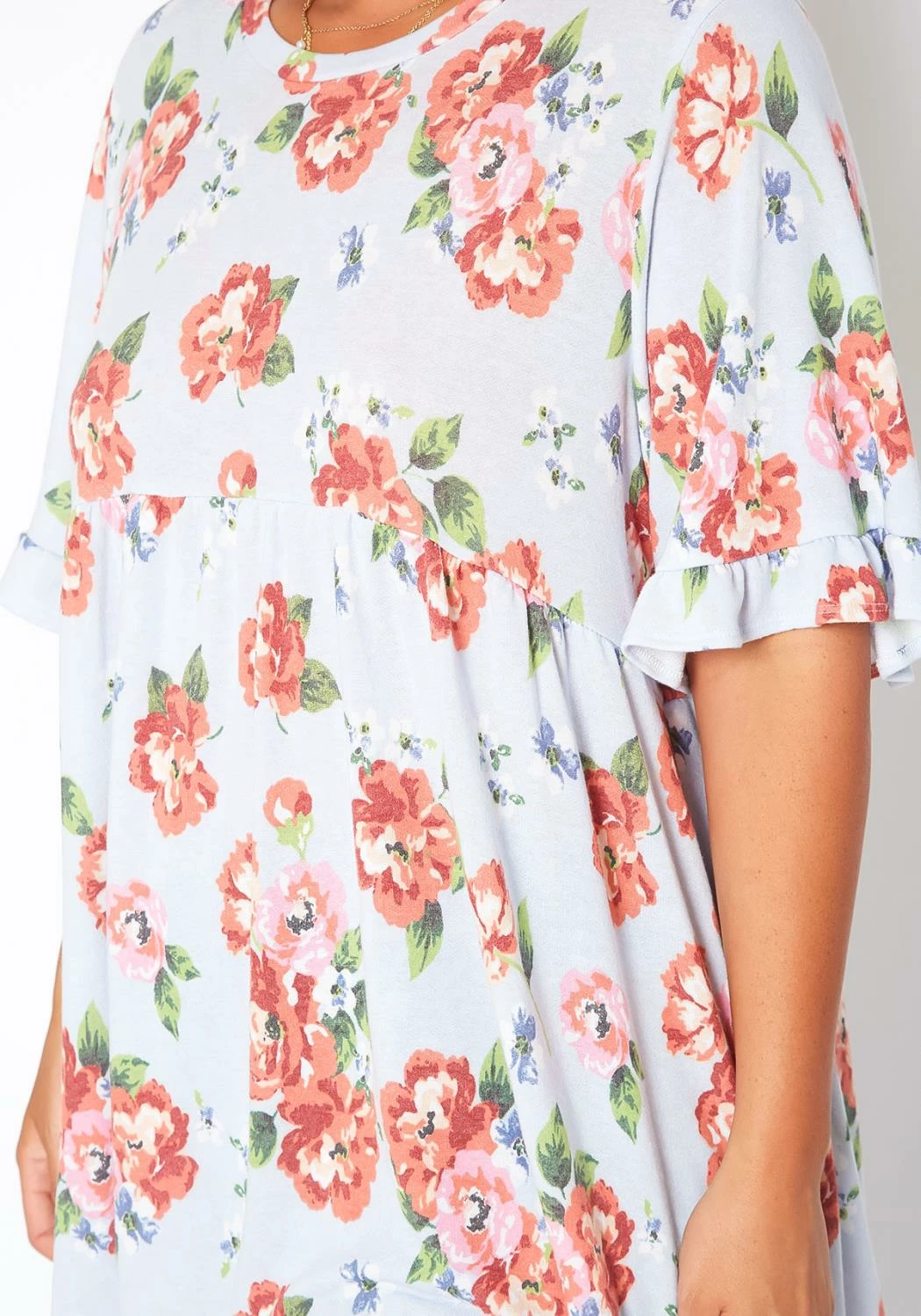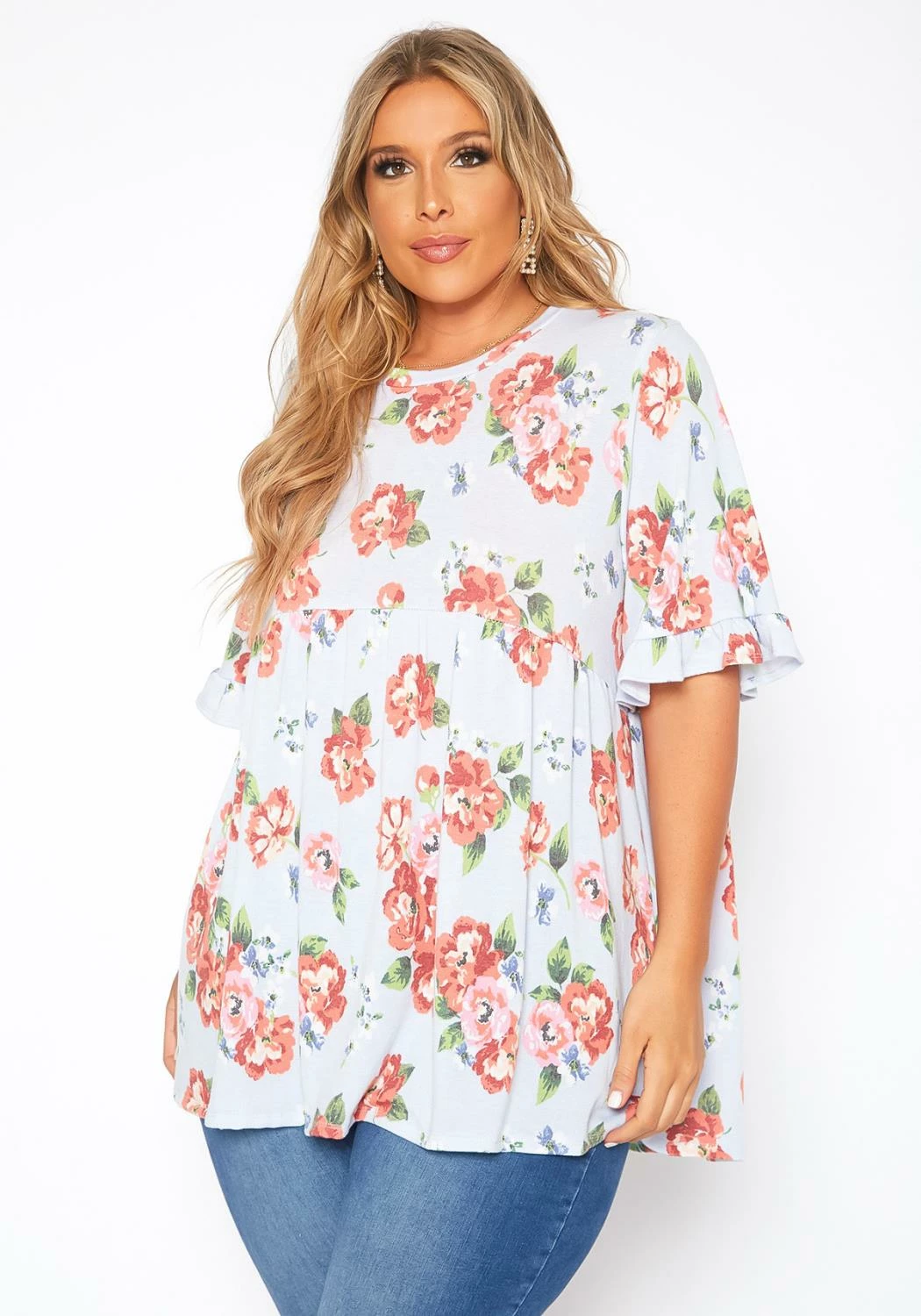 Lovely plus size women’s t-shirt in floral print, crew neck style, half sleeves with ruffle trim and hip length fit.