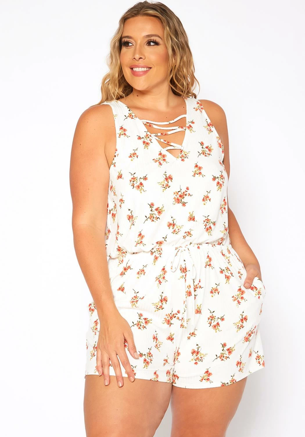 Plus size women’s lovely spring romper in floral print, sleeveless style, v-neck cross-lace front detail, cinched waistline, faux bow tie and pockets.