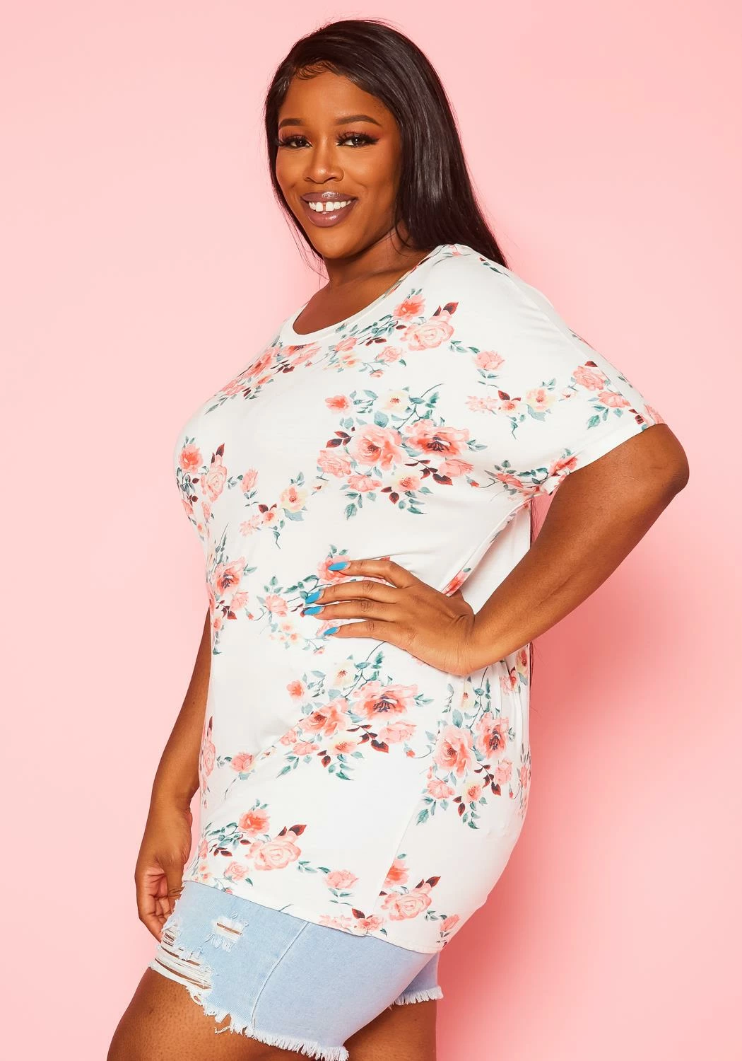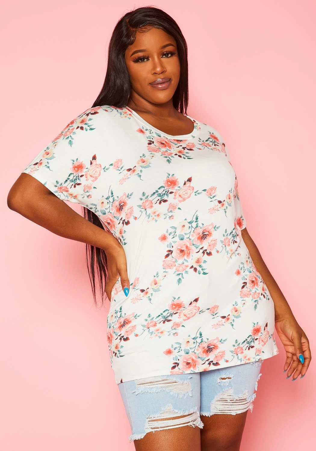 Casual plus size women’s t-shirt in floral print , round-neck style and short sleeves.