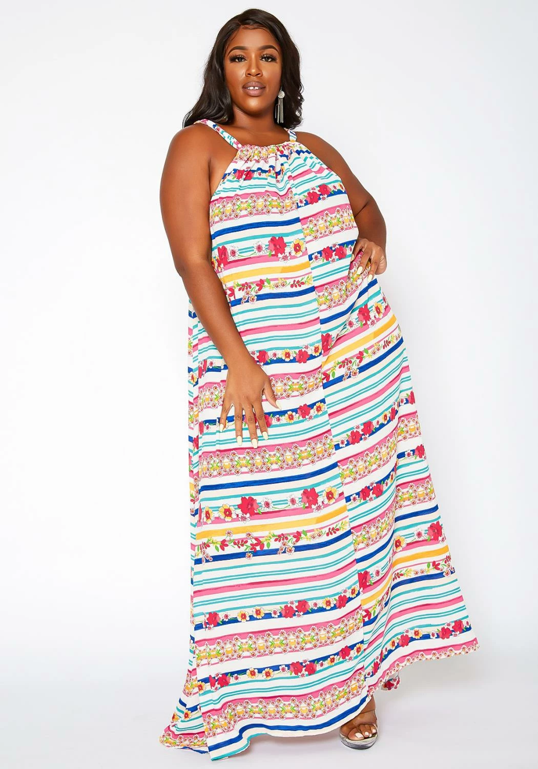 Delightful plus size women’s maxi dress in floral stripe pattern, sleeveless design, fit to flare end, pocket ascent and self tie closure.