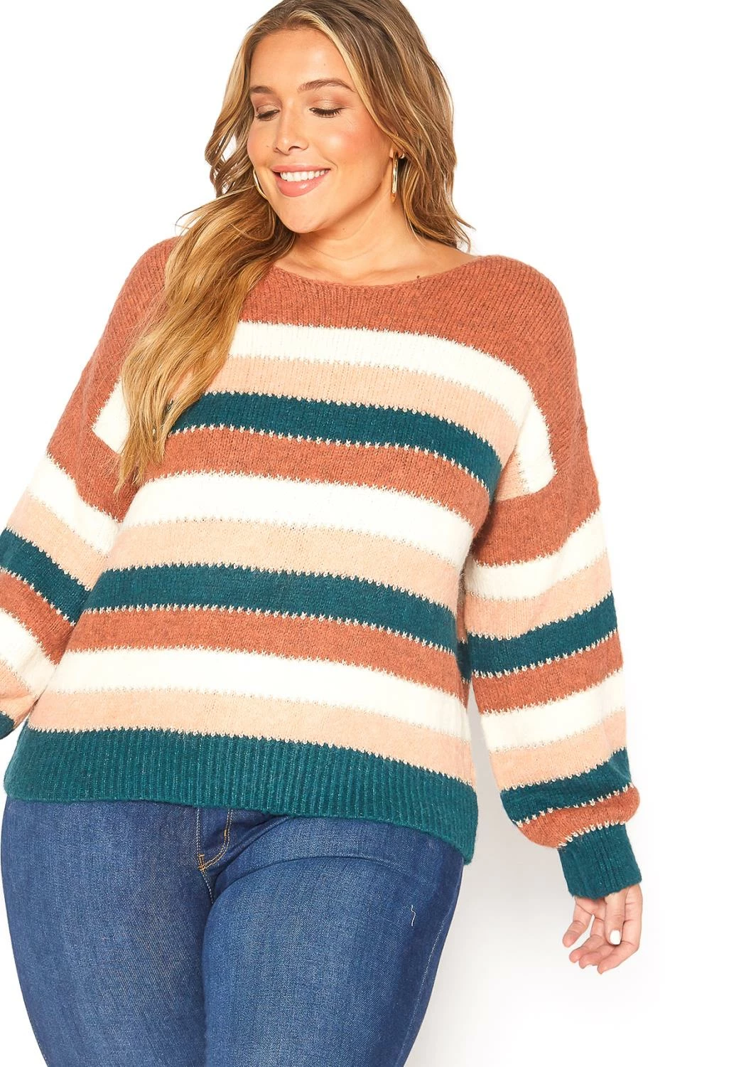 Plus size women’s ultra soft fuzzy crewneck sweater top with multi color stripes.