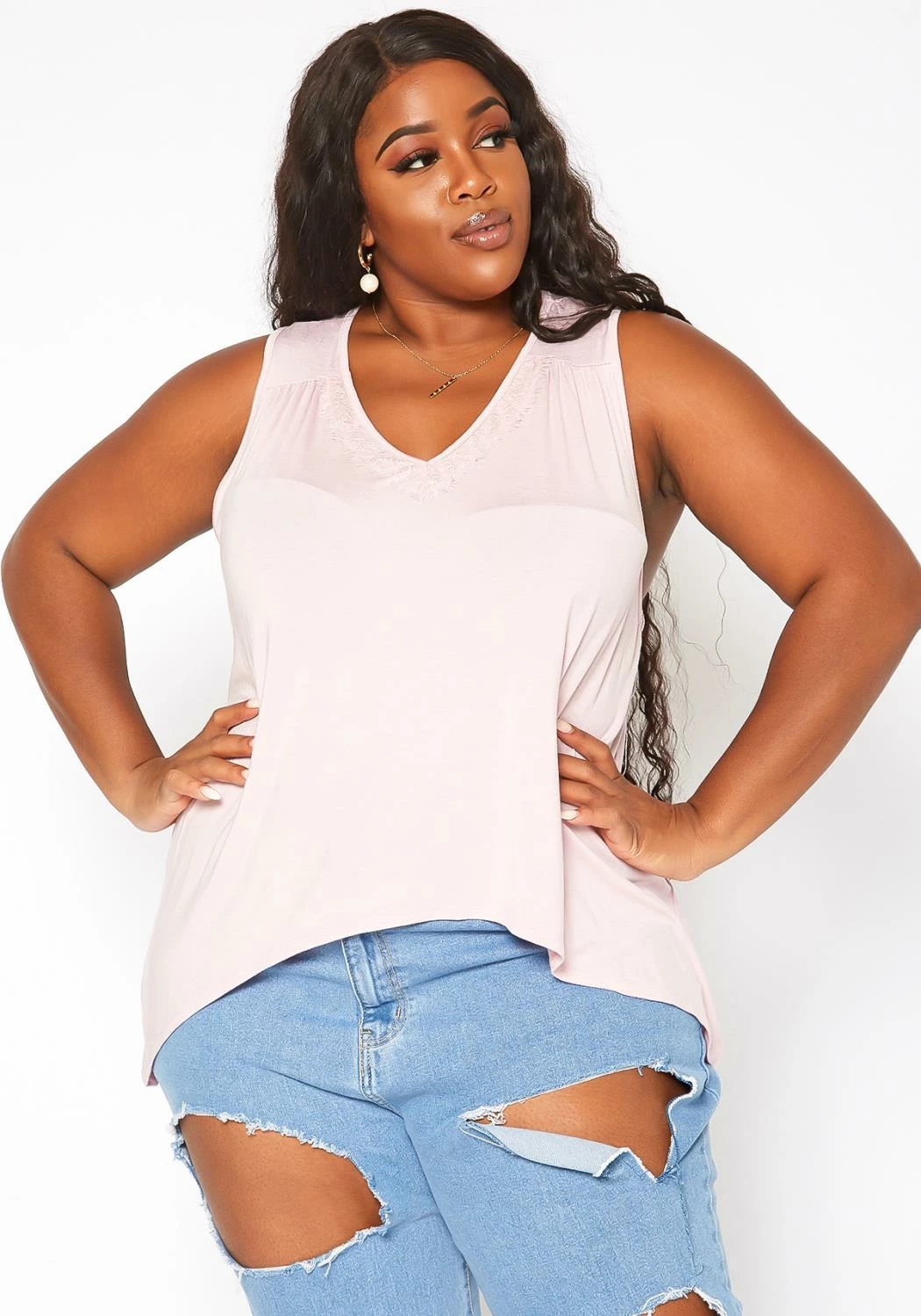Plus size women’s basic tank top in v-neck style, front/back lace hem, high to low design, racerback design and ruched stitching.