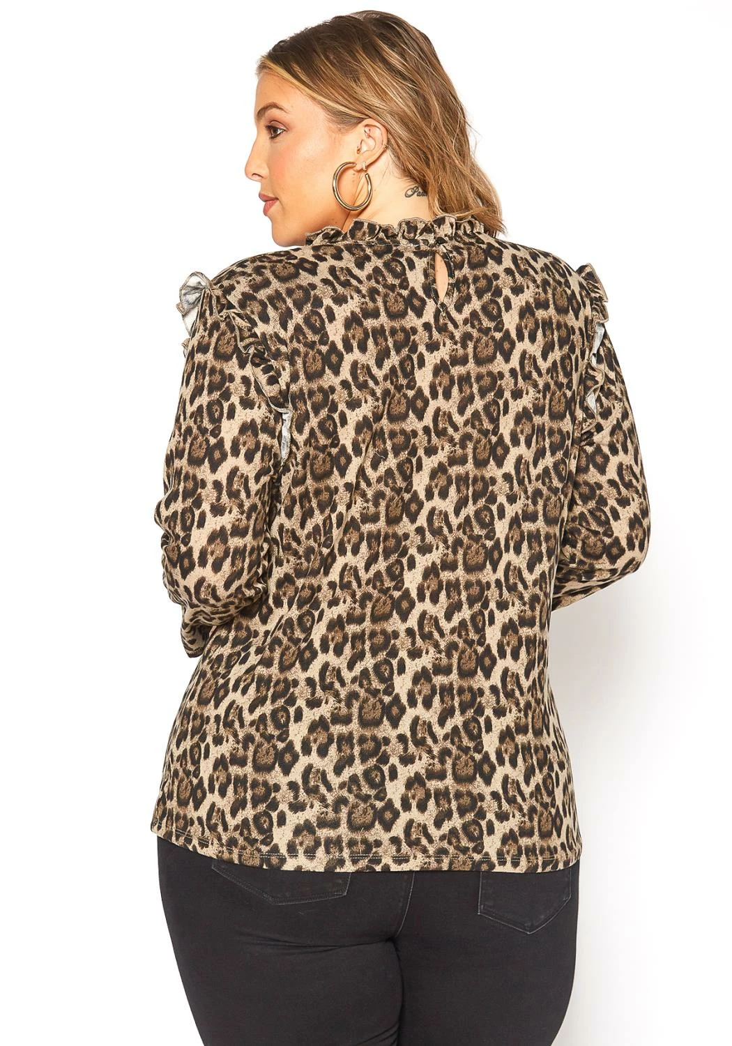 Plus size women’s light ruffle accented knit top with leopard prints.
