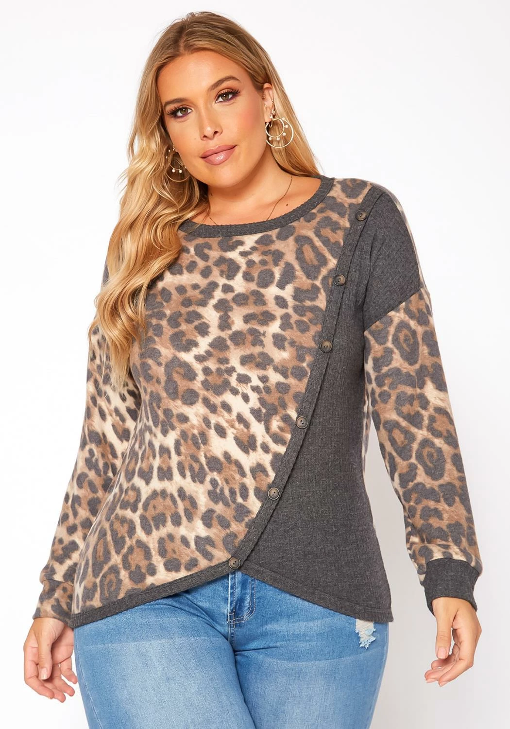 Plus size women’s knit sweater in leopard print splice design, waffle knit splice, button front hem, round neck style and drop shoulder long sleeves.