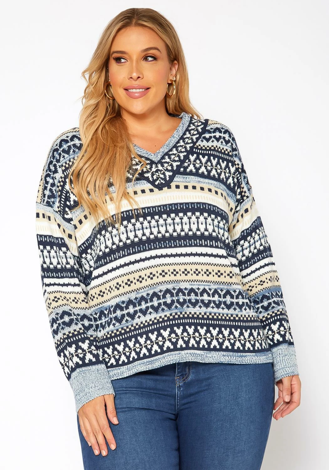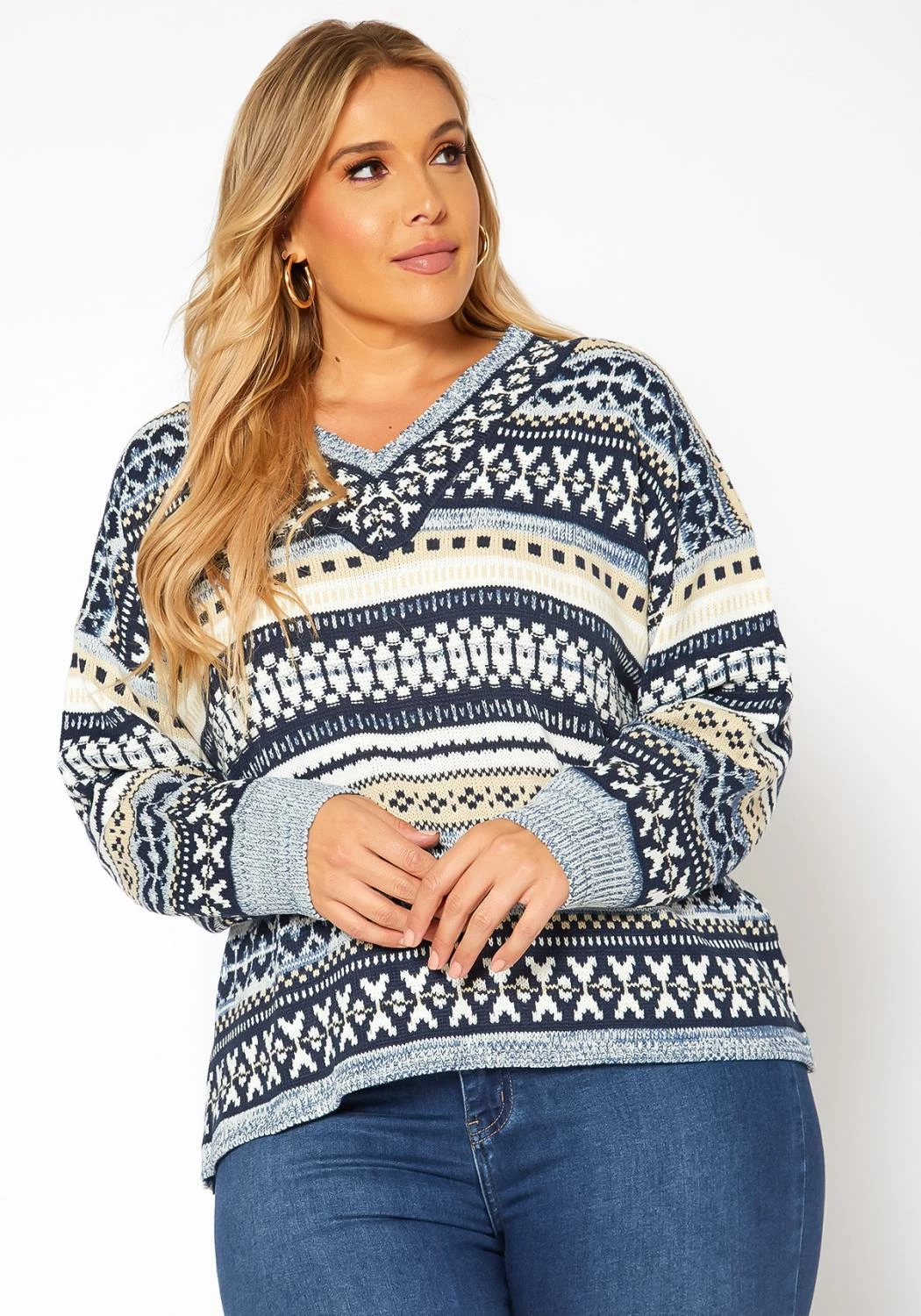 Winter starter cable knit sweater for plus size women with multi pattern, crew neck style and comfy long sleeves.