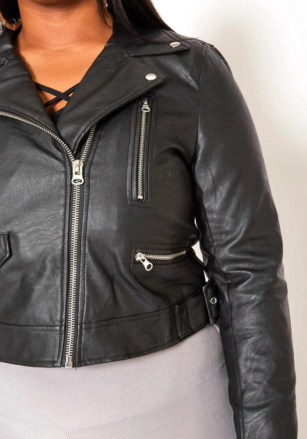 An everyday layer throw on essential faux leather jacket which features a notch collar, zipper ascents and a front zipper closure.