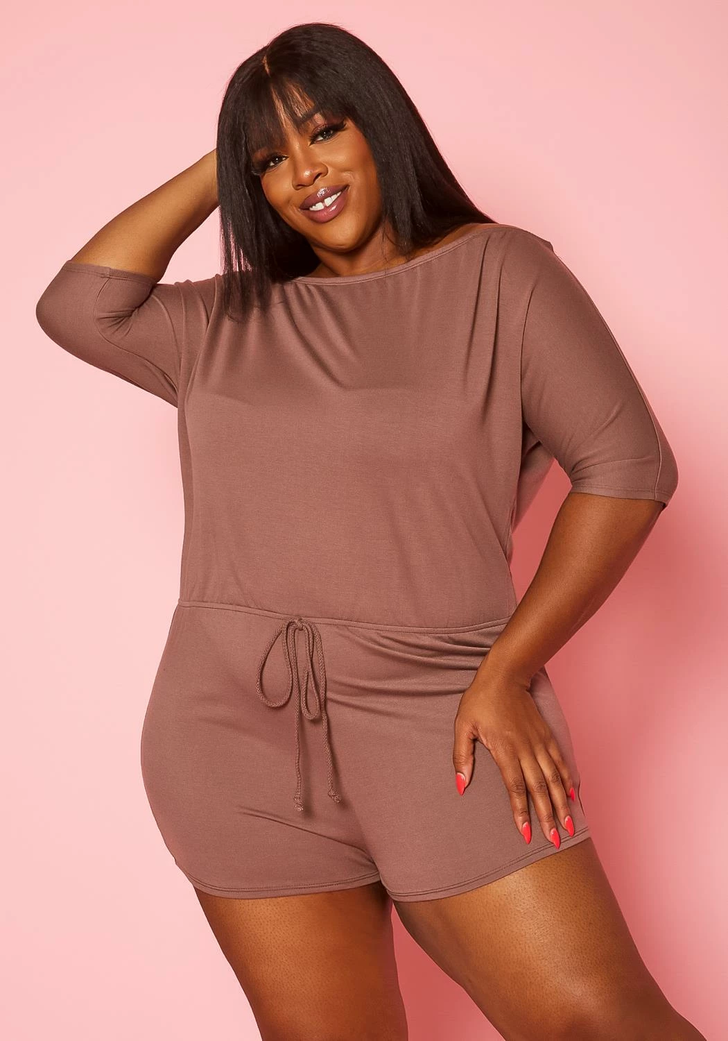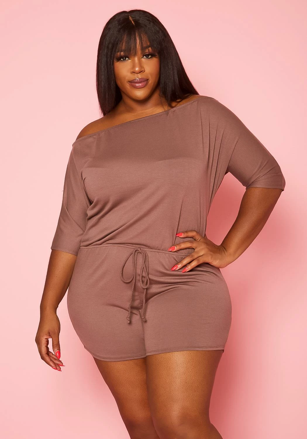 Plus size women’s lounge romper in off shoulder style, half fitted sleeves, elastic waistline and faux bow tie.