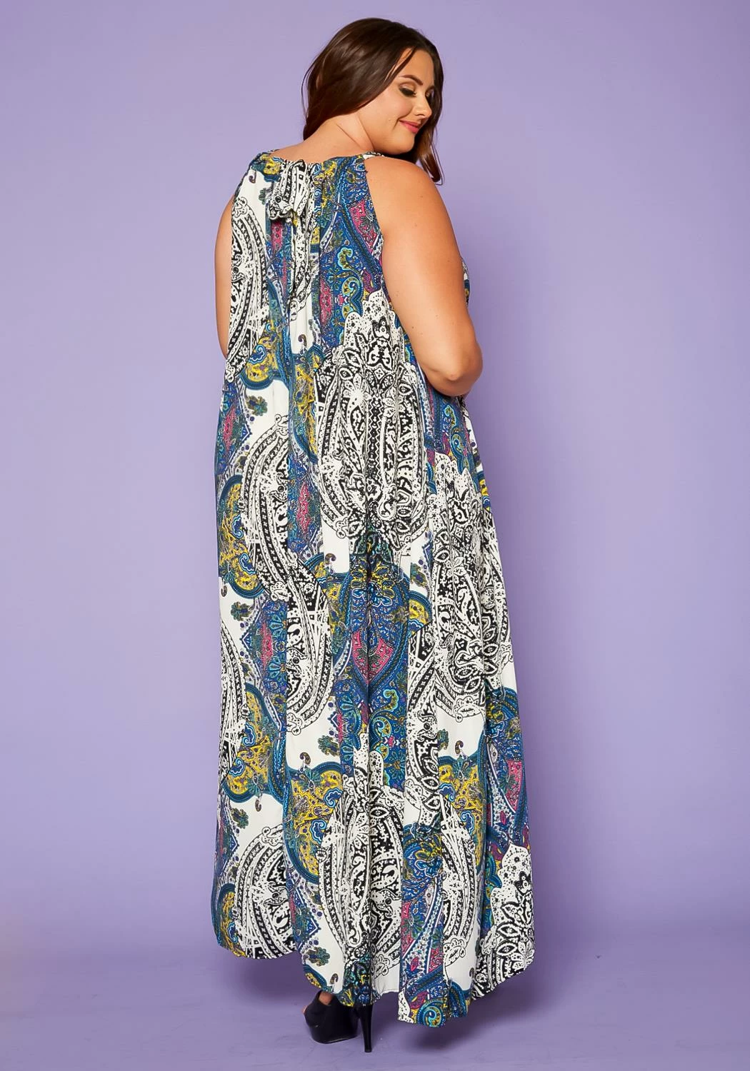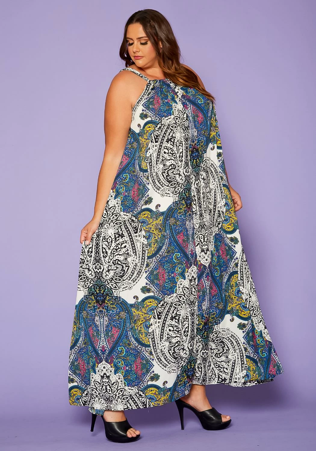 Delightful plus size women’s maxi dress in paisley pattern, sleeveless design, halter top hem, fit to flare end, pocket ascent and back tie closure.