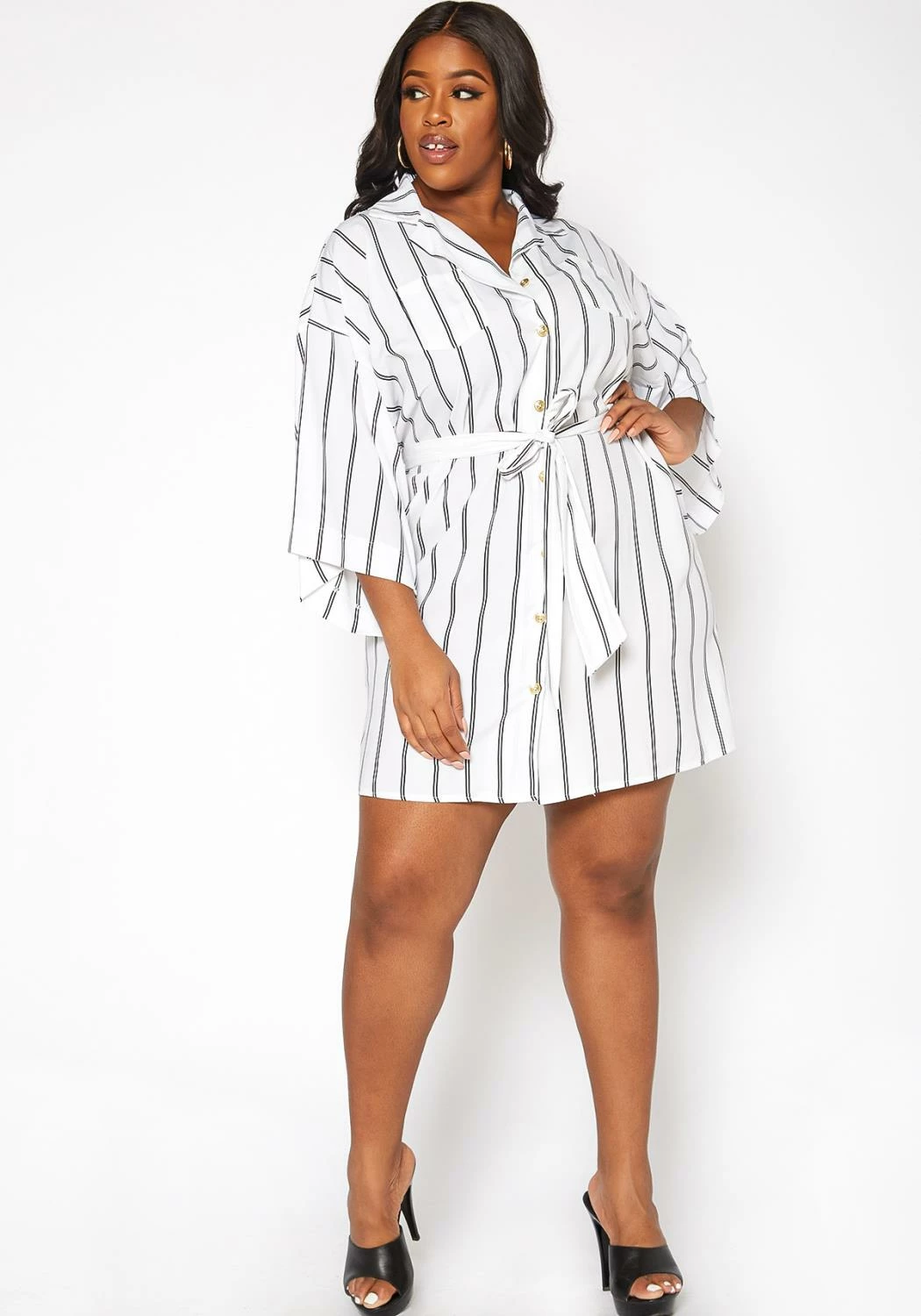 Plus size women’s pin striped print mini dress in collar neck style, button front closure, flared short sleeves, curved hem and matching waist tie ascent.