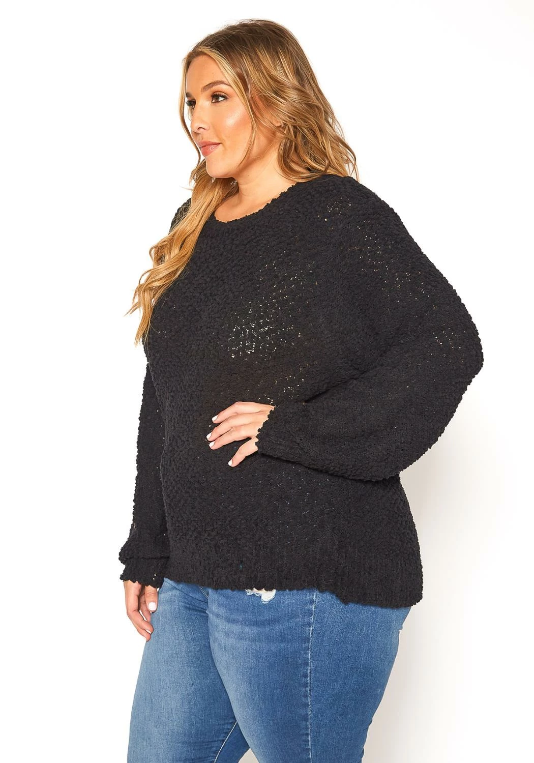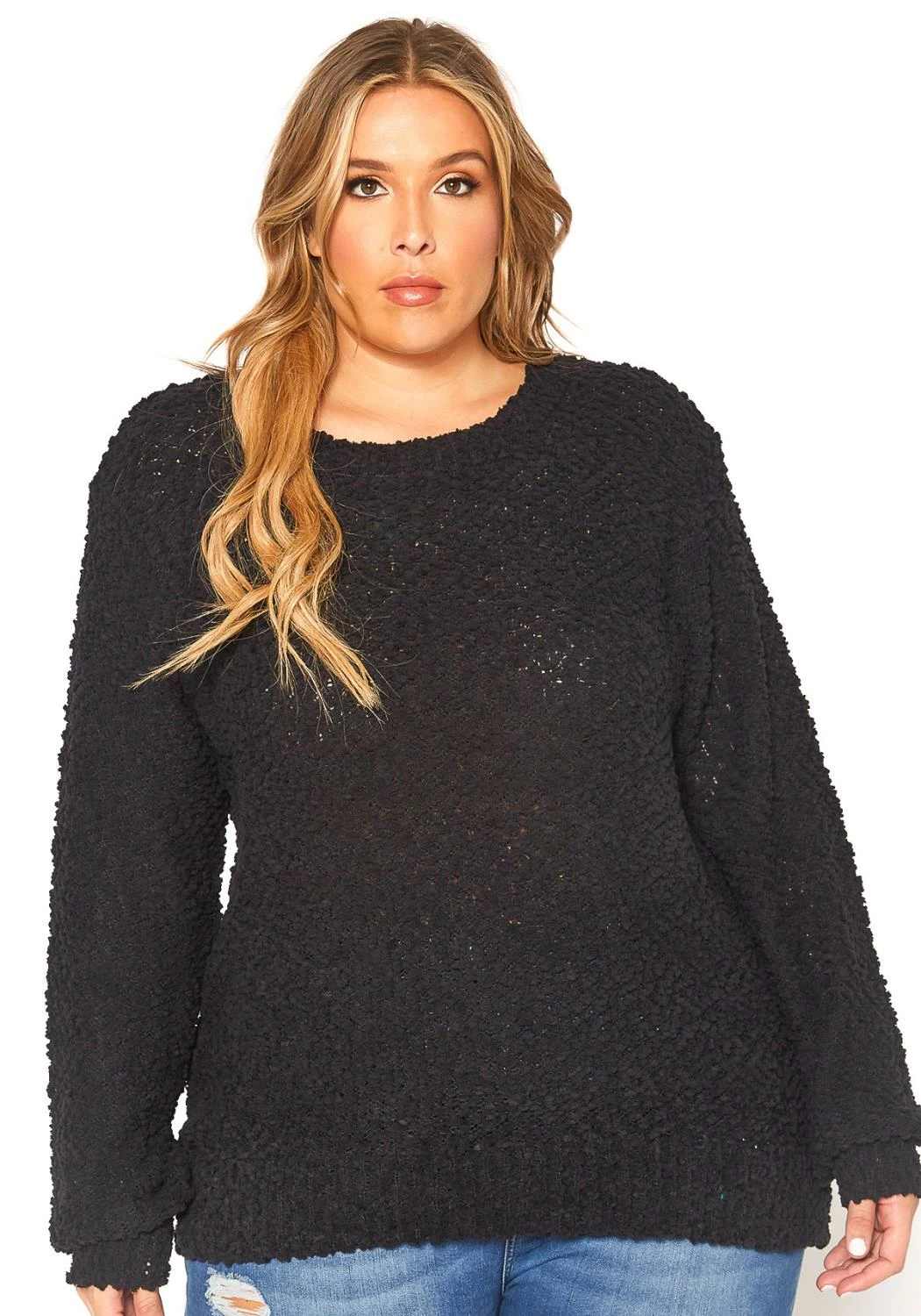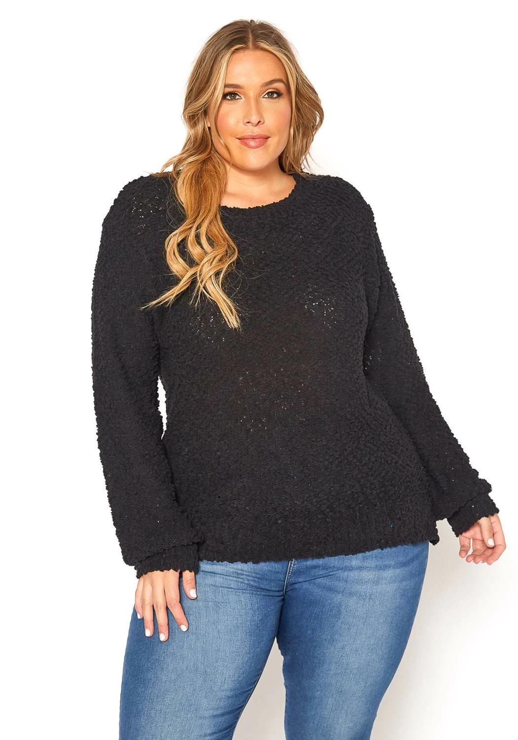 Plus size women’s cozy popcorn knitted sweater in crew neck style and oversized long sleeves.