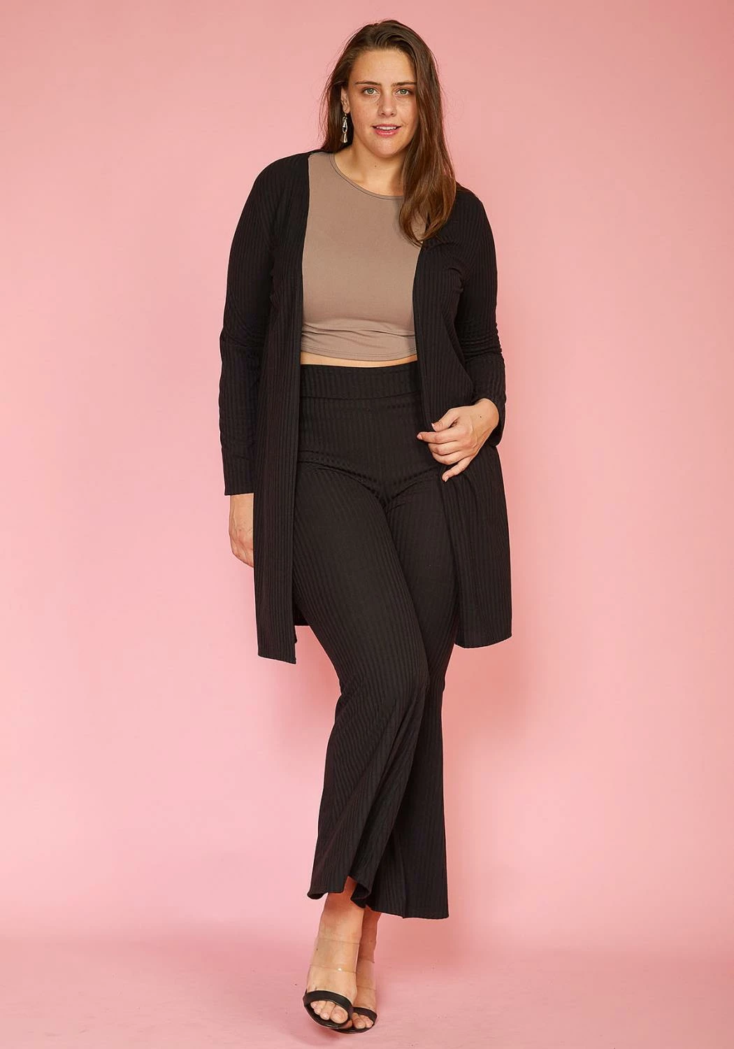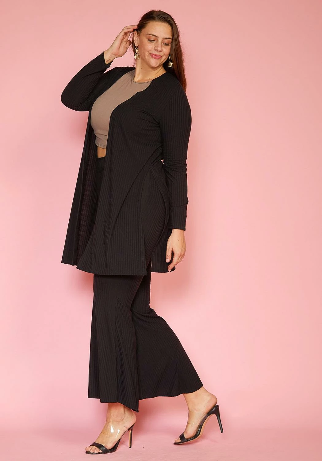 Open front cardigan and its matching high waist pants. Easily pair your favorite top with this set.