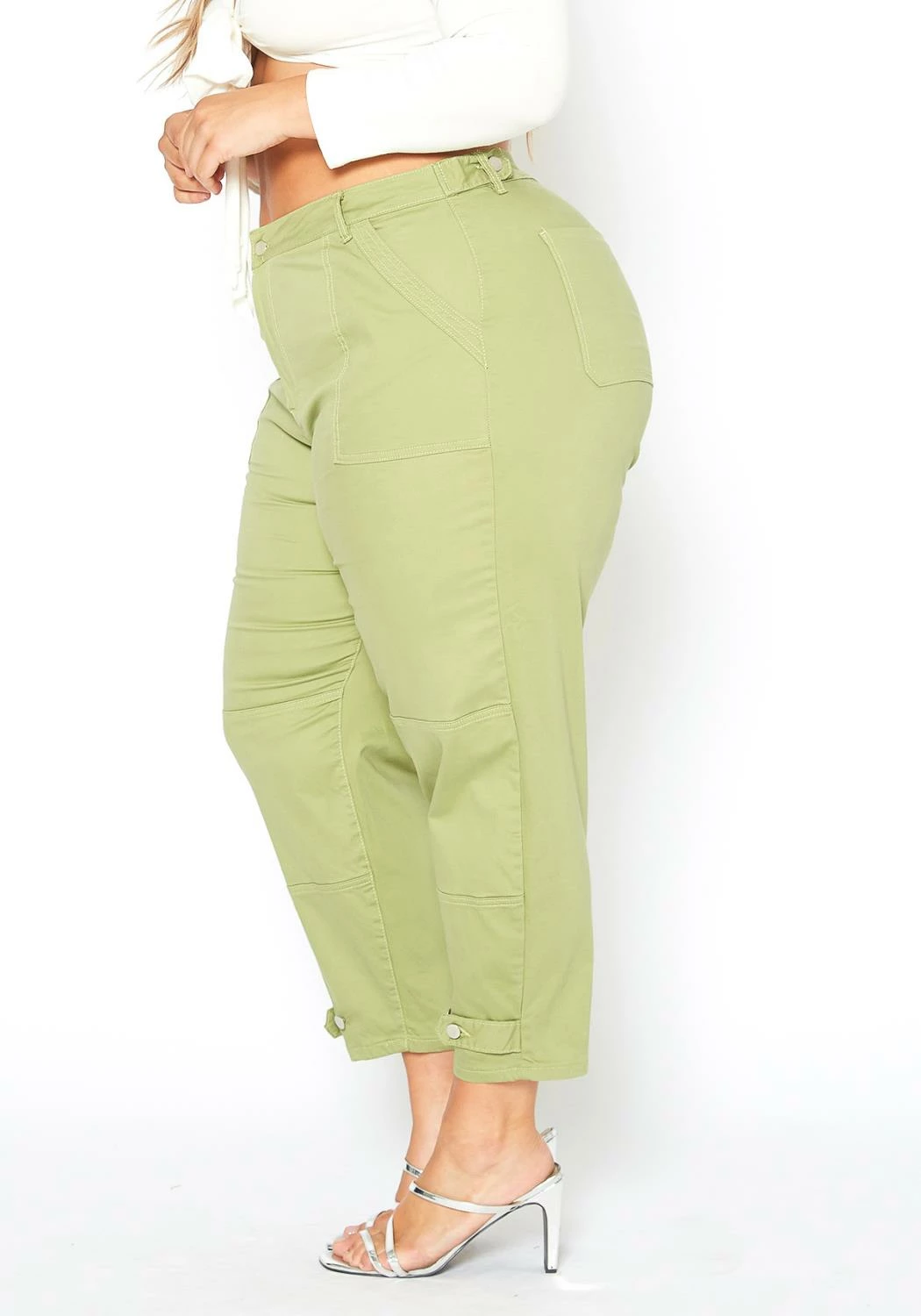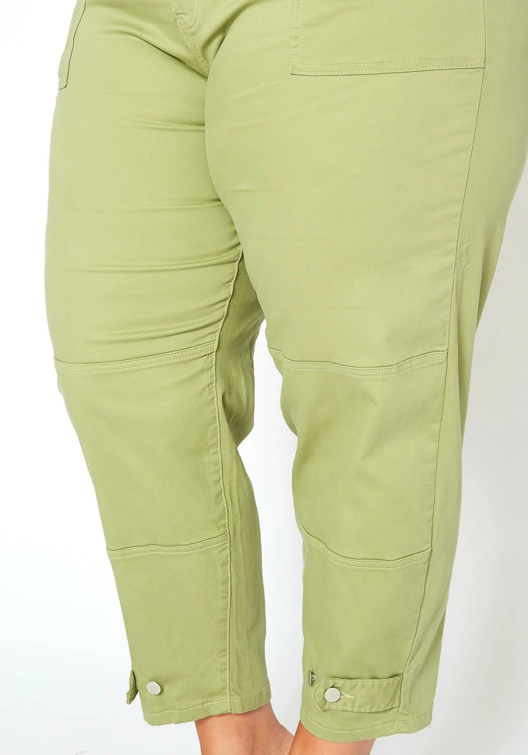 Fresh and trendy plus size women’s utility cargo pants in lovely sage green color plus features belt loop holes, pockets and button ankle ascent.