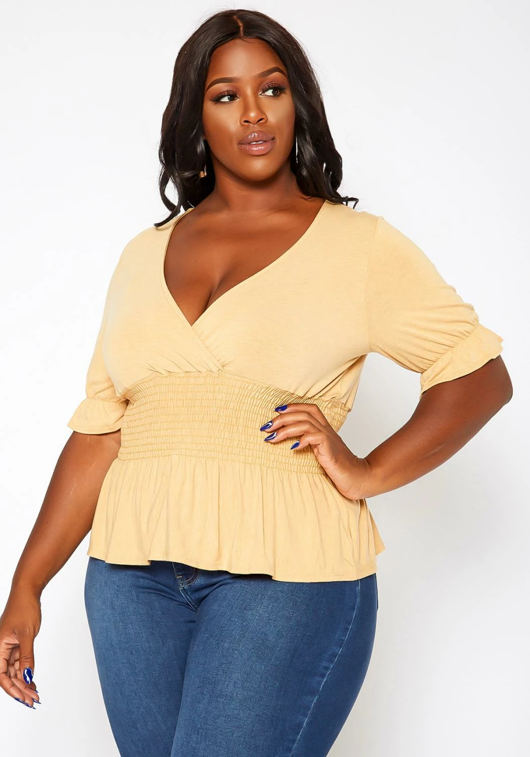Lovely basic plus size women’s top in v-neck style, puffy short sleeves, smocked hem and flare end.