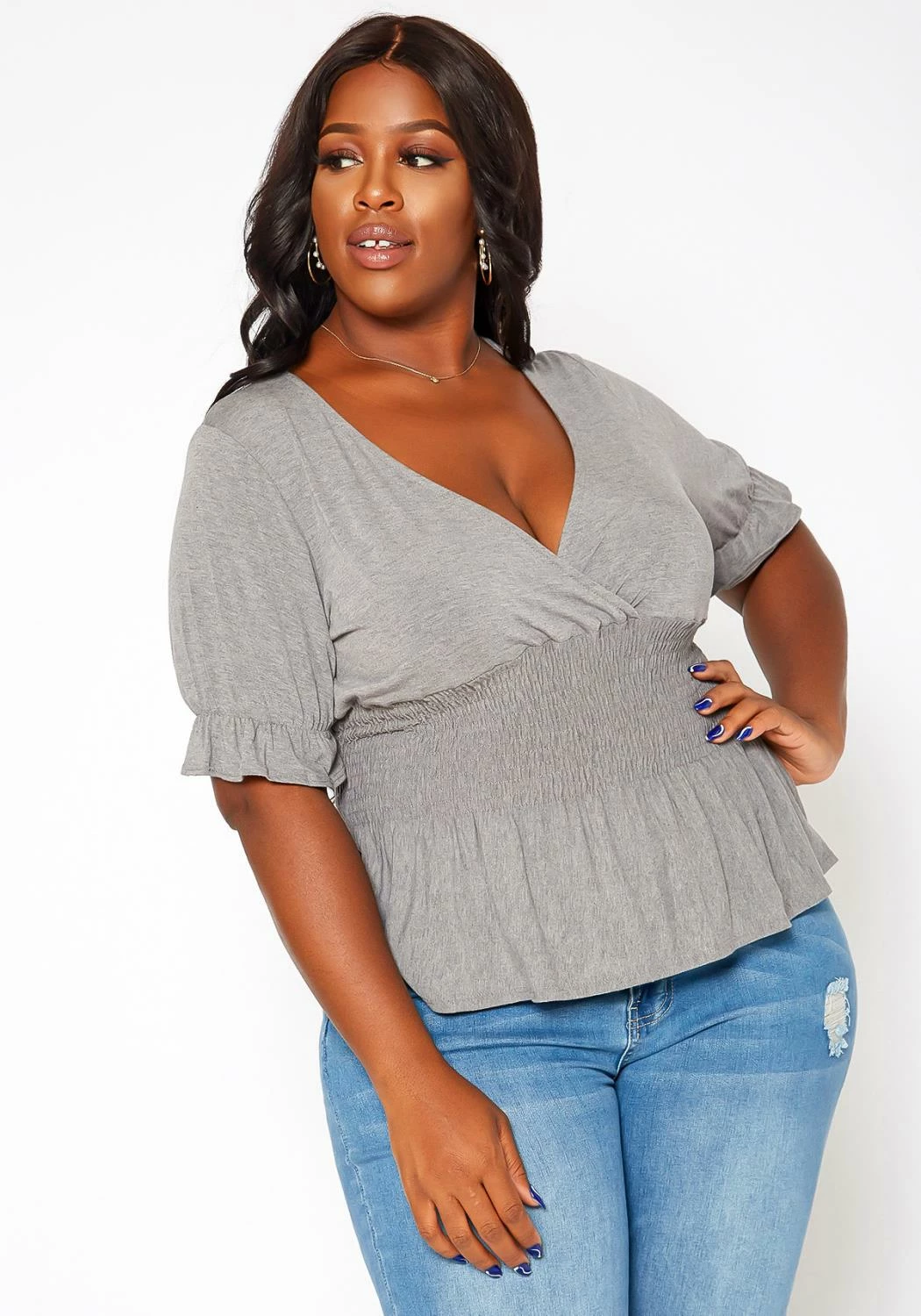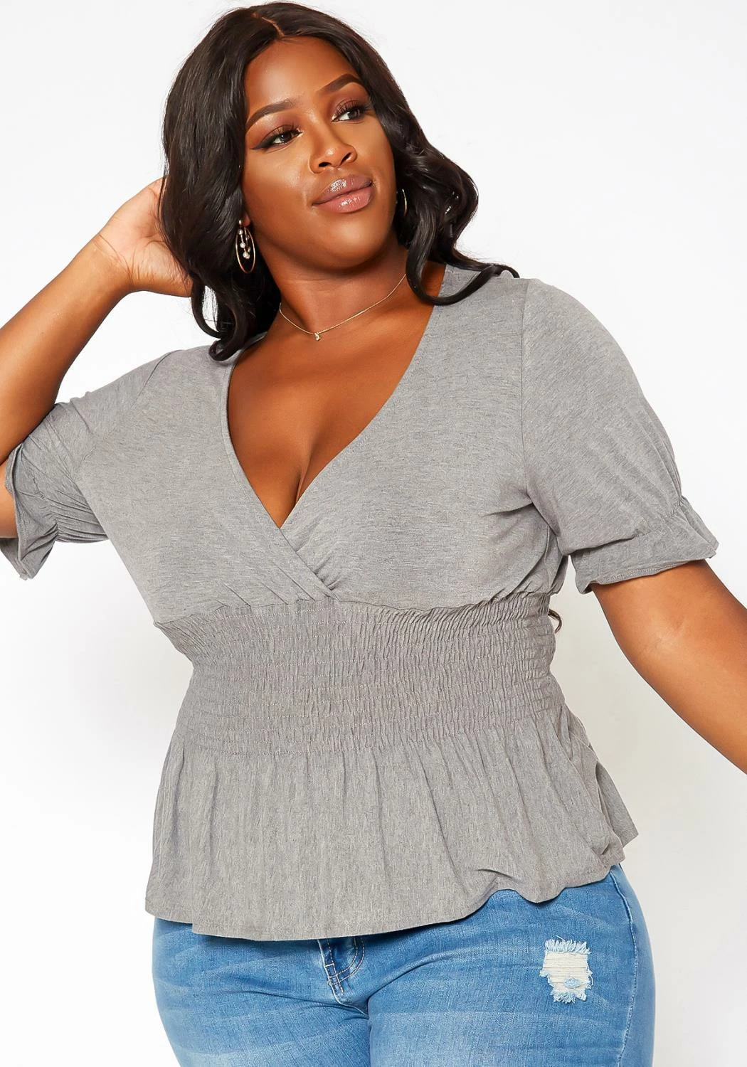 Lovely basic plus size women’s top in v-neck style, puffy short sleeves, smocked hem and flare end.