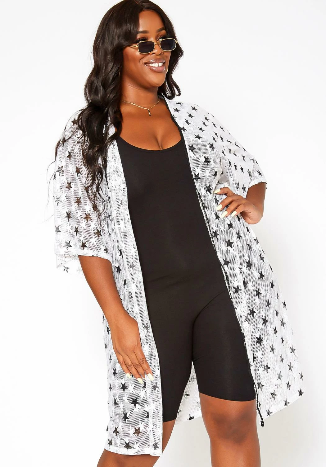 Plus size women’s lightweight kimono cardigan in star pattern, fishnet material, dolman short sleeves, open front design and crochet trim.