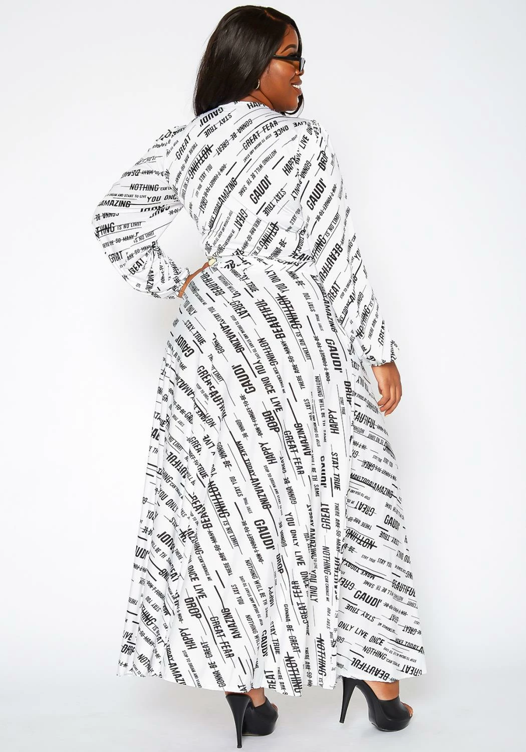 Plus size women’s statement matching set which features a wrap long sleeve blouse and maxi flare skirt with side pockets.