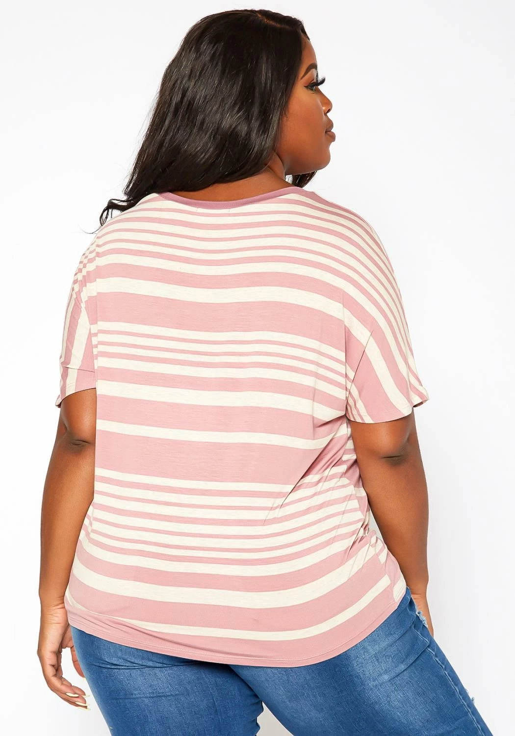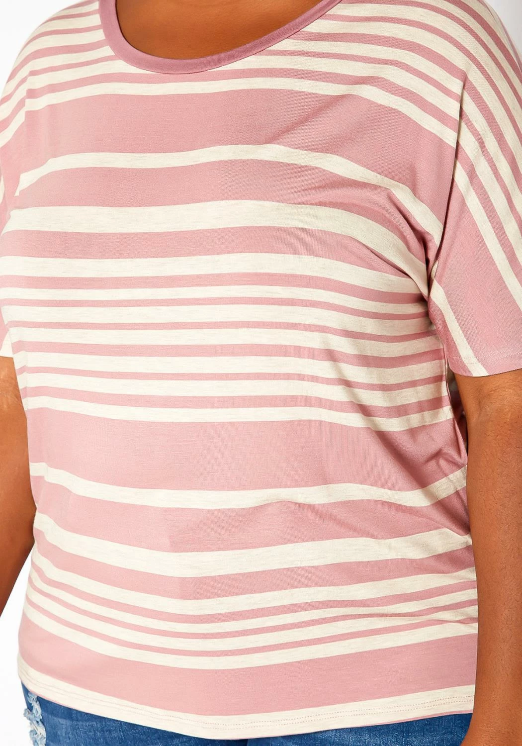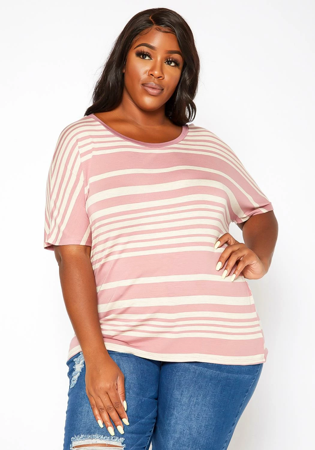 Casual plus size women’s t-shirt in striped print, round-neck style and short sleeves.