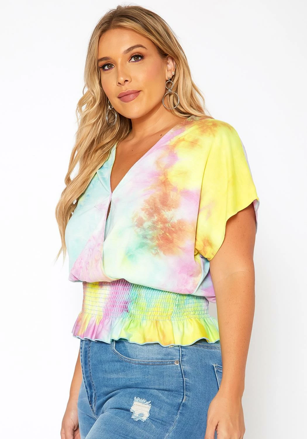 Summer tie dye plus size women’s top in v-neck style short dolman sleeves and smocked hem for stretch support.