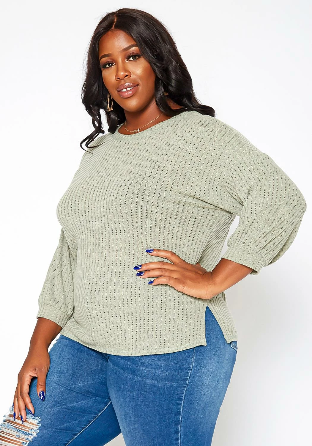 Casual plus size women’s waffle knit sweater in crew neck style, drop shoulder long sleeves, fitted wrist cuffs and open v-back design.