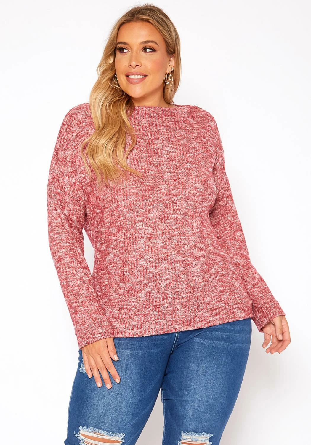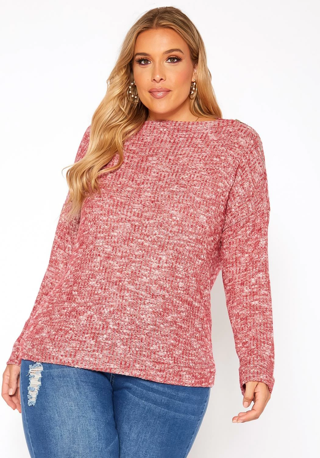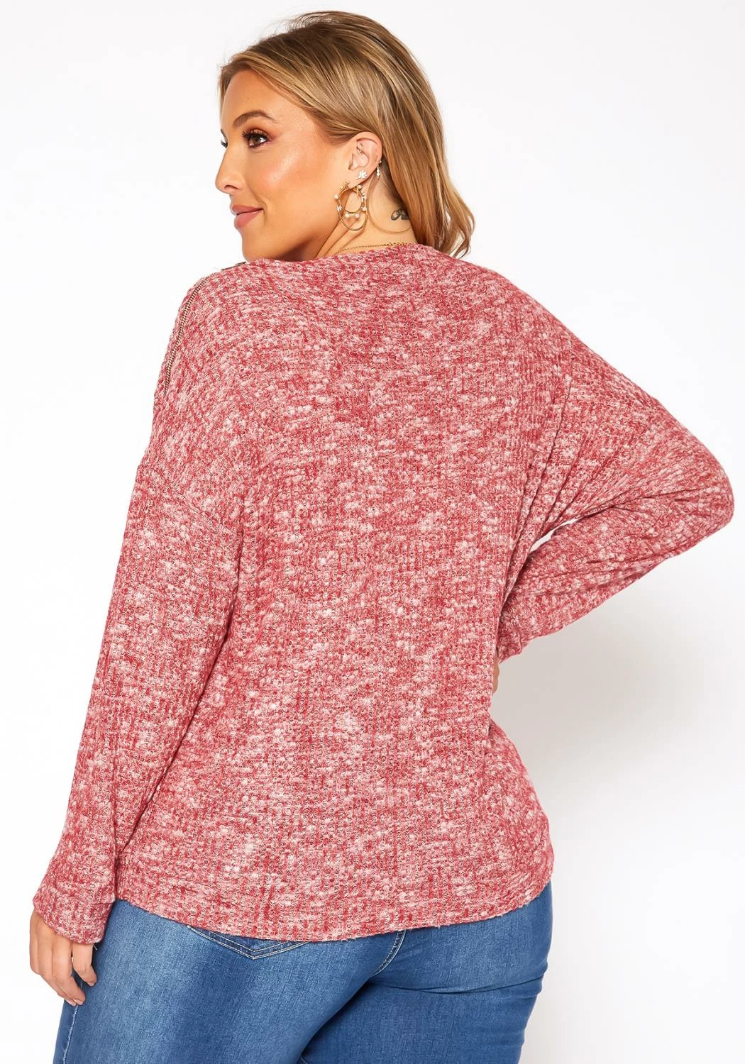 Casual waffle knit sweater for plus size women with wide neckline, drop shoulder long sleeves, and one sided zipper shoulder detail.