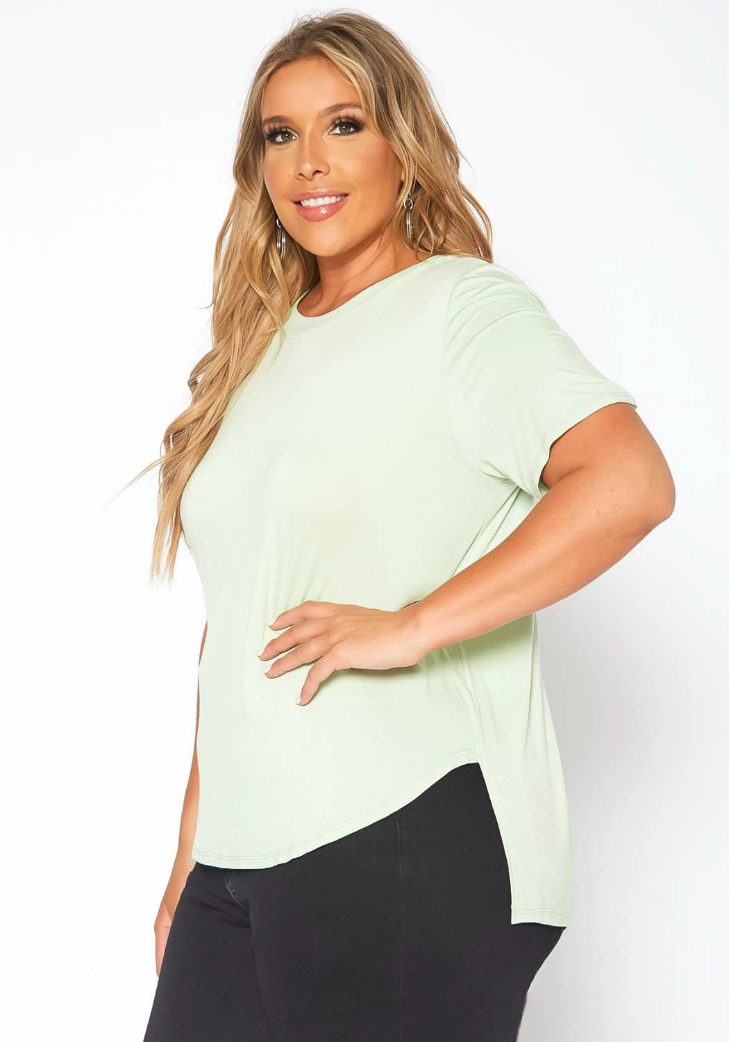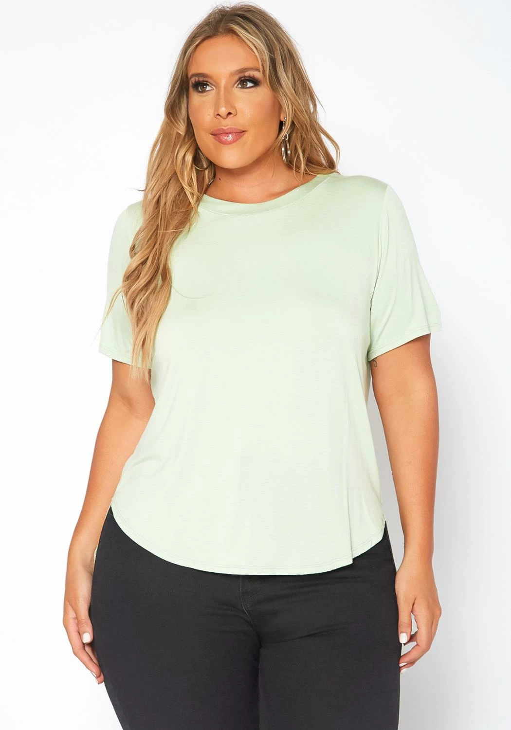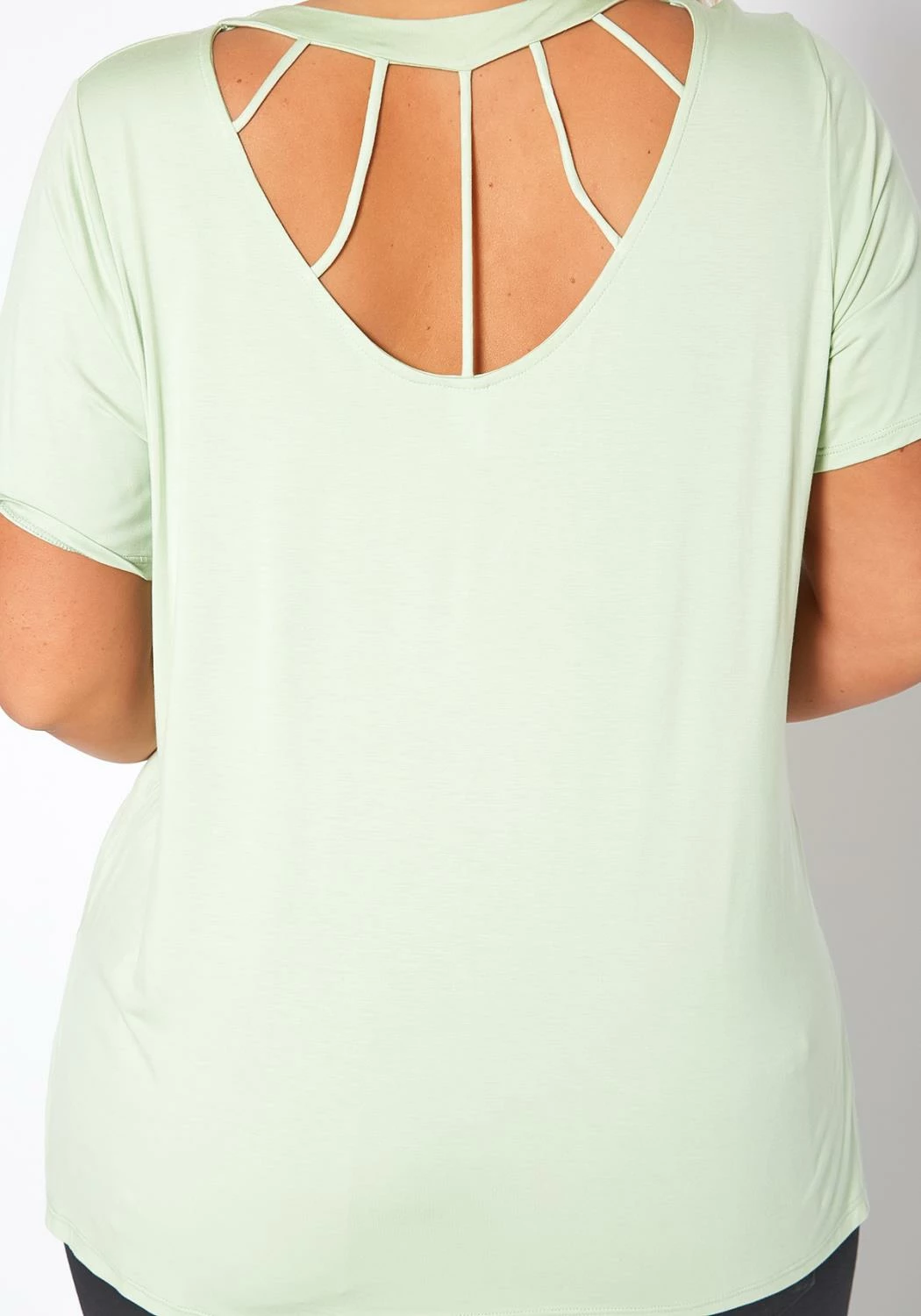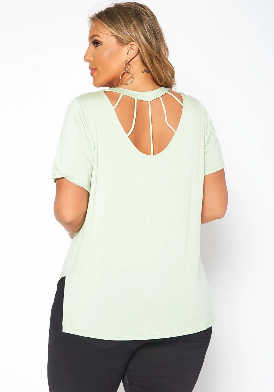 Plus size women’s essential basic t-shirt with unique windowpane back cut-out design, short sleeve, crew neck style and side slit hem.