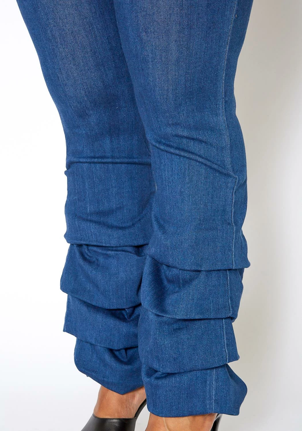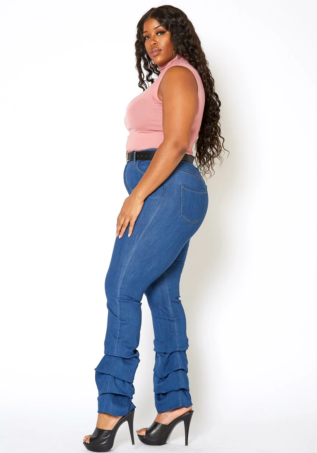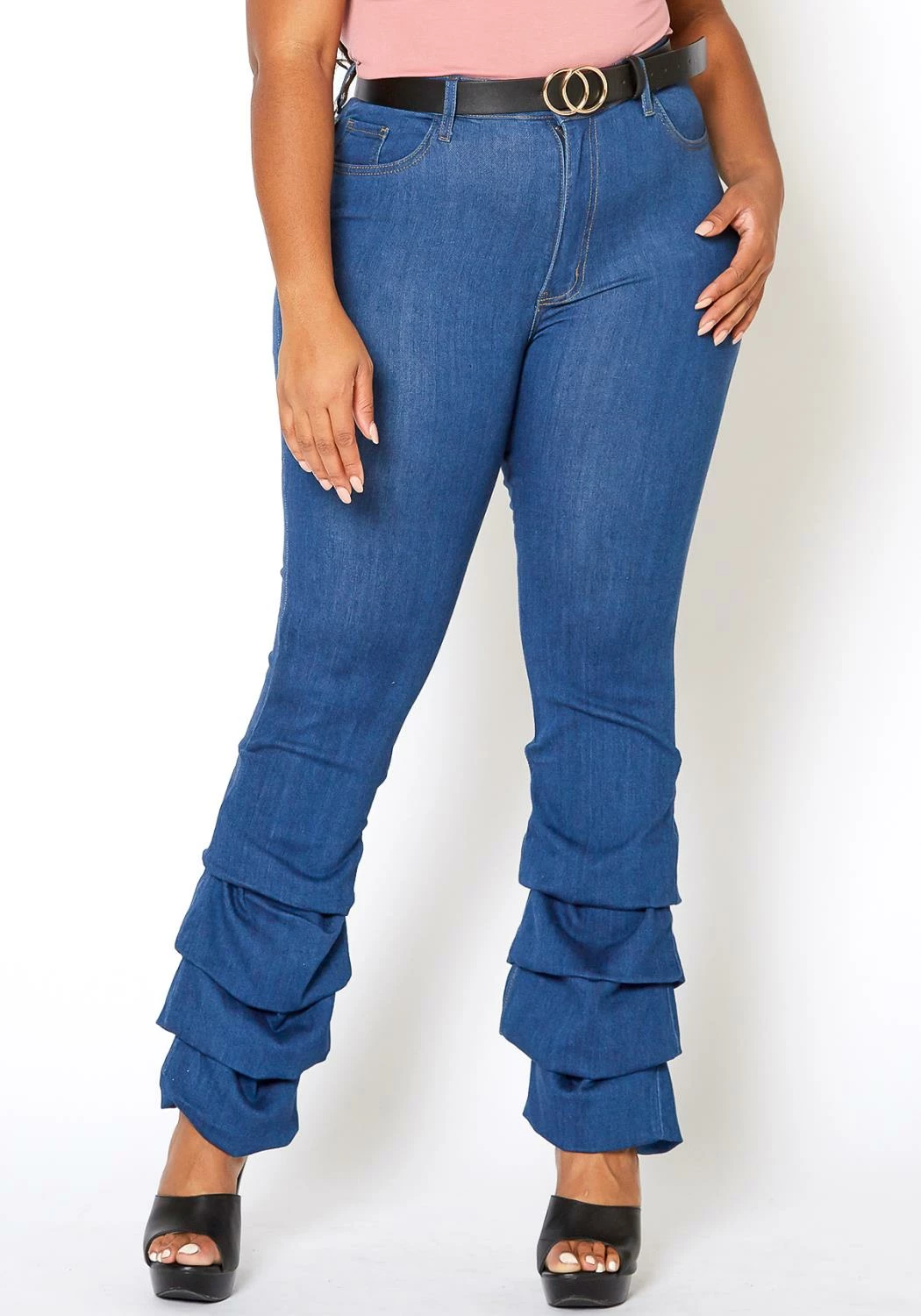 Asoph x Vibrant plus size women’s denim jean with unique ankle scrunched gather hem for a flattering chic style. Contains pockets and belt loop holes.