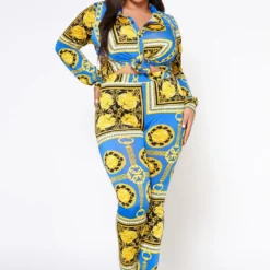 Plus Size Golden Brocade Print Collar Top & Leggings Set