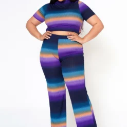 Plus Size Gradient Color Print Crop Top & Ribbed Pants Set