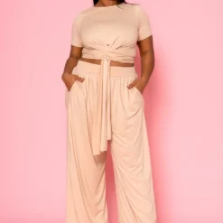 Plus Size Tie Front Crop Top & Wide Flare Pants Set