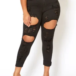 Vibrant Plus Size Stripe Distressed Black Denim Skinny Jean
