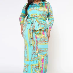 Plus Size Brocade Print Collar Top & Flare Pants Set