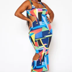 Plus Size Abstract Pattern Cut-Out Midi Dress
