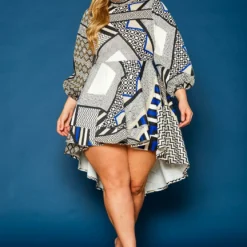 Plus Size Geo Print High To Low Flare Dress