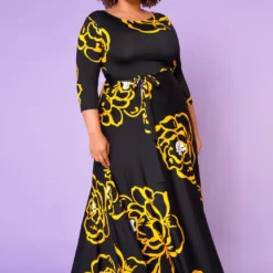 Plus Size Golden Floral Print Fit & Flare Maxi Dress