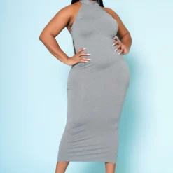 Plus Size Golden Shimmer Halter Neck Midi Dress