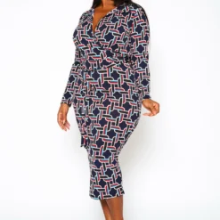 Plus Size Abstract Print Belted Bodycon Midi Dress