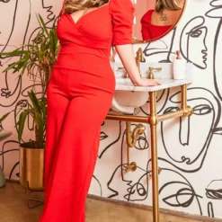 Asoph Plus Size Ruched Shoulder Puff Straight Jumpsuit