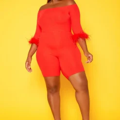 Plus Size Feather Trim Off Shoulder Bodycon Romper