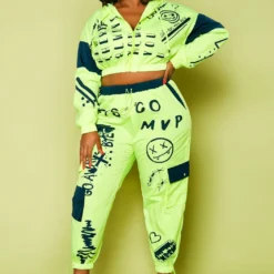 Plus Size Color Block Graphic Cropped Hoodie & Pants Set