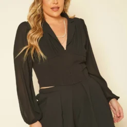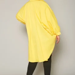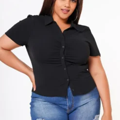 Plus Size Collar Neck Puff Sleeve Linen Shirt