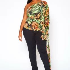 Plus Size Print One Sleeve Drape Hem Blouse